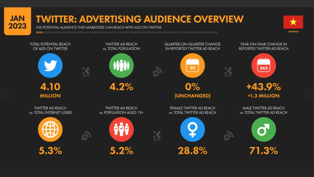 Tuy nhiên, Twitter chỉ hạn chế sử dụng nền tảng cho những người từ 13 tuổi trở lên nên con số này chỉ thể hiện 5,2% đối tượng “đủ điều kiện” ở Việt Nam sử dụng Twitter trong năm 2023.