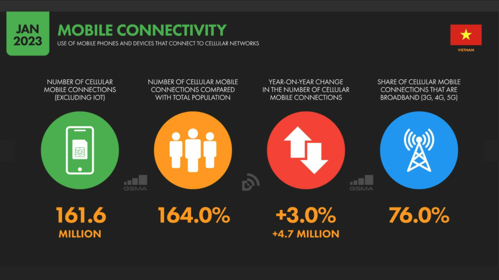 Theo dữ liệu từ GSMA Intelligence, vào đầu năm 2023, Việt Nam có 161,6 triệu kết nối di động. Tuy nhiên, cần lưu ý rằng nhiều người sử dụng nhiều hơn một kết nối di động, ví dụ như một kết nối cho mục đích cá nhân và một kết nối khác cho công việc.