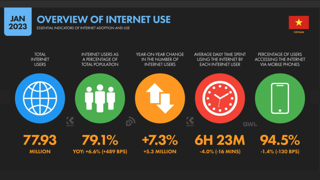 Đầu năm 2023, Việt Nam có 77,93 triệu người dùng Internet, chiếm 79,1% tổng dân số. Ngoài ra, số lượng người dùng mạng xã hội cũng đạt con số 70 triệu, tương đương với 71% tổng dân số. Tổng số kết nối di động đang hoạt động là 161,6 triệu, tương đương với 164,0% tổng dân số.