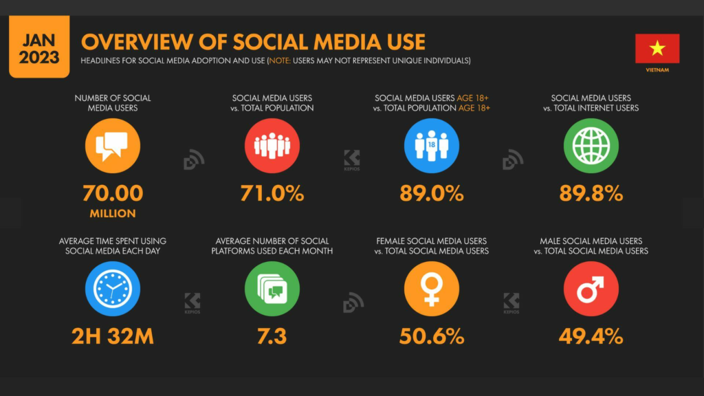 Tuy nhiên, không phải mỗi tài khoản người dùng mạng xã hội đều tương ứng với một cá nhân duy nhất. Tại đầu năm 2023, số lượng người dùng mạng xã hội ở Việt Nam đạt 71,0% tổng dân số, nhưng theo dữ liệu từ các công cụ lập kế hoạch quảng cáo của các nền tảng mạng xã hội hàng đầu, chỉ có 64,40 triệu người dùng từ 18 tuổi trở lên.