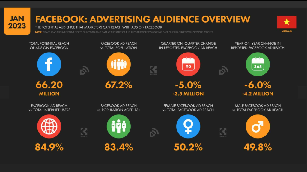 Trong khoảng thời gian từ tháng 10 năm 2022 đến tháng 1 năm 2023, phạm vi tiếp cận quảng cáo của Facebook tại Việt Nam giảm 3,5 triệu (-5,0%). Phạm vi tiếp cận quảng cáo của Facebook tại Việt Nam tương đương với 67,2% tổng dân số vào đầu năm 2023 và 84,9% cơ sở người dùng Internet tại địa phương (bất kể độ tuổi) vào tháng 1 năm 2023.