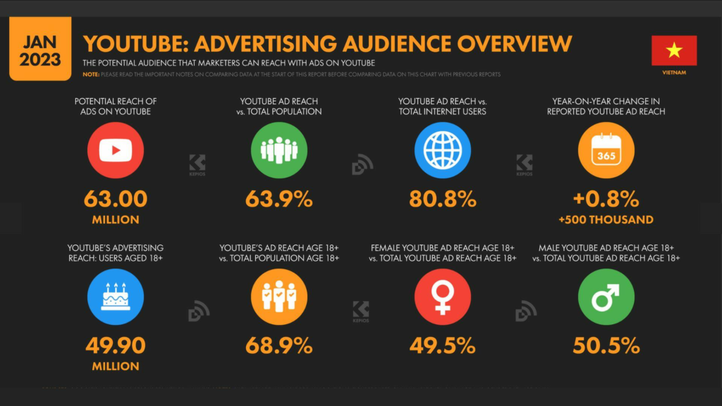 Để dễ hình dung, quảng cáo trên YouTube đã đạt 80,8% tổng số người dùng Internet của Việt Nam vào tháng 1 năm 2023. Theo số liệu này, 49,5% khán giả xem quảng cáo của YouTube tại Việt Nam là nữ, trong khi 50,5% là nam.