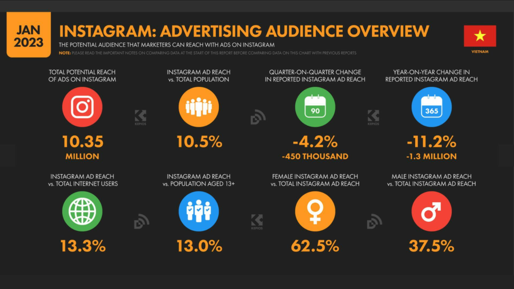 Công cụ quảng cáo của Meta đã công bố con số cho thấy Instagram có 10,35 triệu người dùng tại Việt Nam vào đầu năm 2023. Số liệu được điều chỉnh gần đây của công ty cho thấy phạm vi tiếp cận quảng cáo của Instagram tại Việt Nam tương đương với 10,5% tổng dân số vào đầu năm. Tuy nhiên, cần lưu ý rằng Instagram hạn chế chỉ những người từ 13 tuổi trở lên mới được sử dụng nền tảng của mình. Vì vậy, 13,0% đối tượng “đủ điều kiện” ở Việt Nam sử dụng Instagram vào năm 2023.