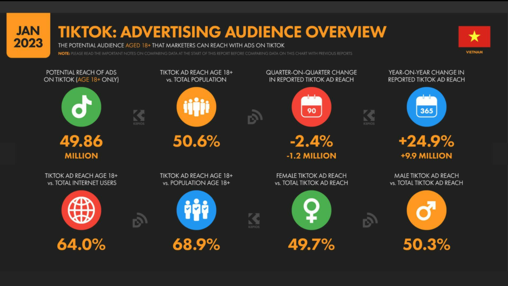 Với bối cảnh này, phạm vi tiếp cận quảng cáo của TikTok đã tiếp cận được 68,9% tổng số người trưởng thành từ 18 tuổi trở lên ở Việt Nam vào đầu năm 2023. Ngoài ra, phạm vi tiếp cận quảng cáo của TikTok tại Việt Nam tương đương với 64,0% cơ sở người dùng Internet địa phương vào đầu năm, bất kể độ tuổi.