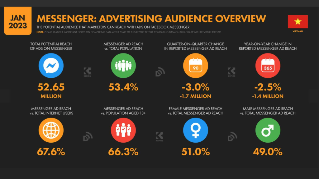 Tuy nhiên, cần lưu ý rằng Facebook Messenger hạn chế sử dụng nền tảng của mình cho người dùng từ 13 tuổi trở lên, vì vậy cần nhấn mạnh rằng quảng cáo tiếp cận được 66,3% đối tượng “đủ điều kiện” của Facebook Messenger tại Việt Nam vào năm 2023.