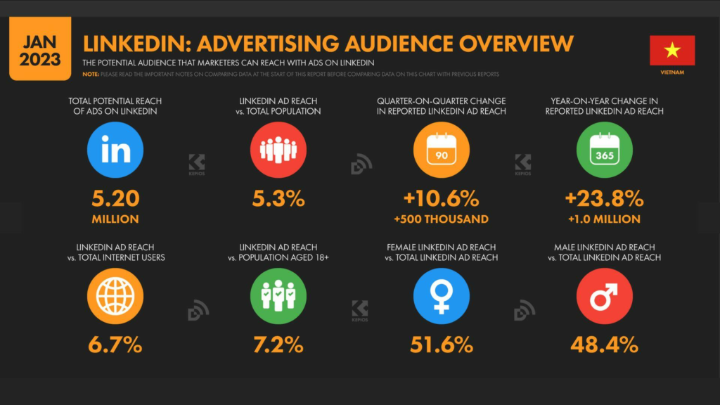 Số liệu về phạm vi tiếp cận quảng cáo của công ty cho thấy lượng khán giả của LinkedIn tại Việt Nam tương đương với 5,3% tổng dân số vào đầu năm 2023.